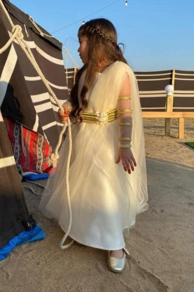فستان بناتي أنيق بتصميم حصري مستوحى من العقالمصنوع من قماش تفته الفاخريأتي بحزام من العقال النجدي مصنوع يدويأكمام خارجية مميزةتل مثبت على الأكتافيأتي بتغليف مميز من لمسة وقتالمقاسات حسب العمر