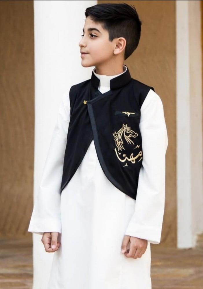 من متجر لمسة وقت فخامة مع زخرفة الحروف العربية والاسم بطريقة فنية وبلونه الأسود الأنيق وهو متوفر للأعمار من 6 شهور حتى سنة ولكن بمقاسات تناسب الأجسام النحيفة والمتوسطة فقط