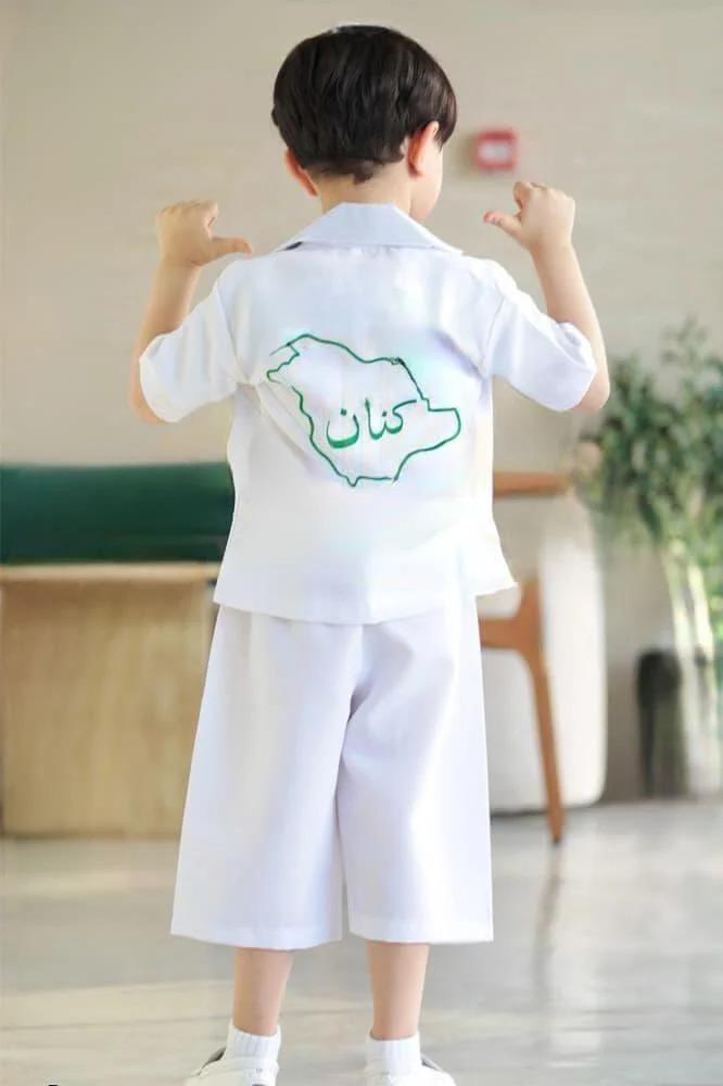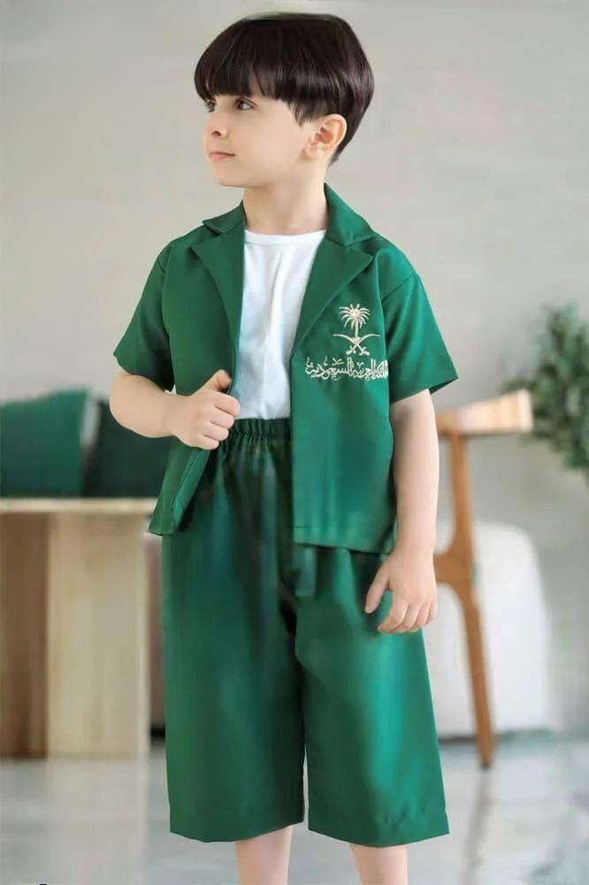 أحصلي الأن على طقم جاكيت برمودة اليوم الوطني بتصميم ملكي مميز باللونين الأخضر والأبيض بتطريز خريطة الوطن من الخلف مع شعار الهوية الوطنية من الأمام تطريز، مصنع من أجود أنواع الأقمشة ليناسب طفلك وليبدو أنيق بطلته الجميلة في اليوم الوطني